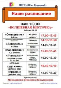 С 1 сентября 2021 года по настоящее время руководитель изостудии Мерзлякова Вероника Вендлиновна.